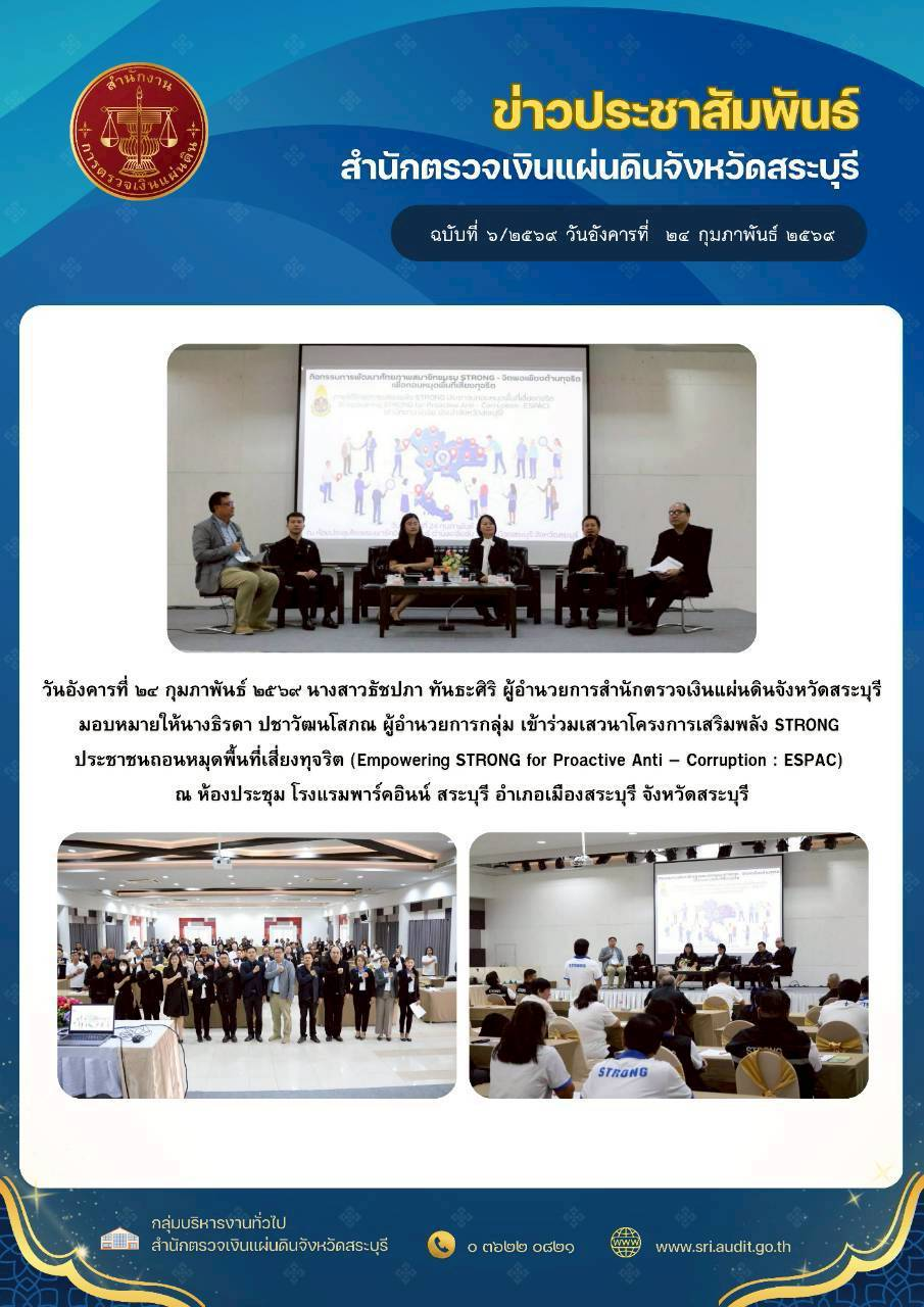 ร่วมเสวนาโครงการเสริมพลัง STRONG ประชาชนถอนหมุดพื้นที่เสี่ยงทุจริต (ESPAC)ข่าวที่น่าสนใจ, ข่าวประชาสัมพันธ์กุมภาพันธ์ 24, 2026มีนาคม 19, 2026 Post Views: 8
